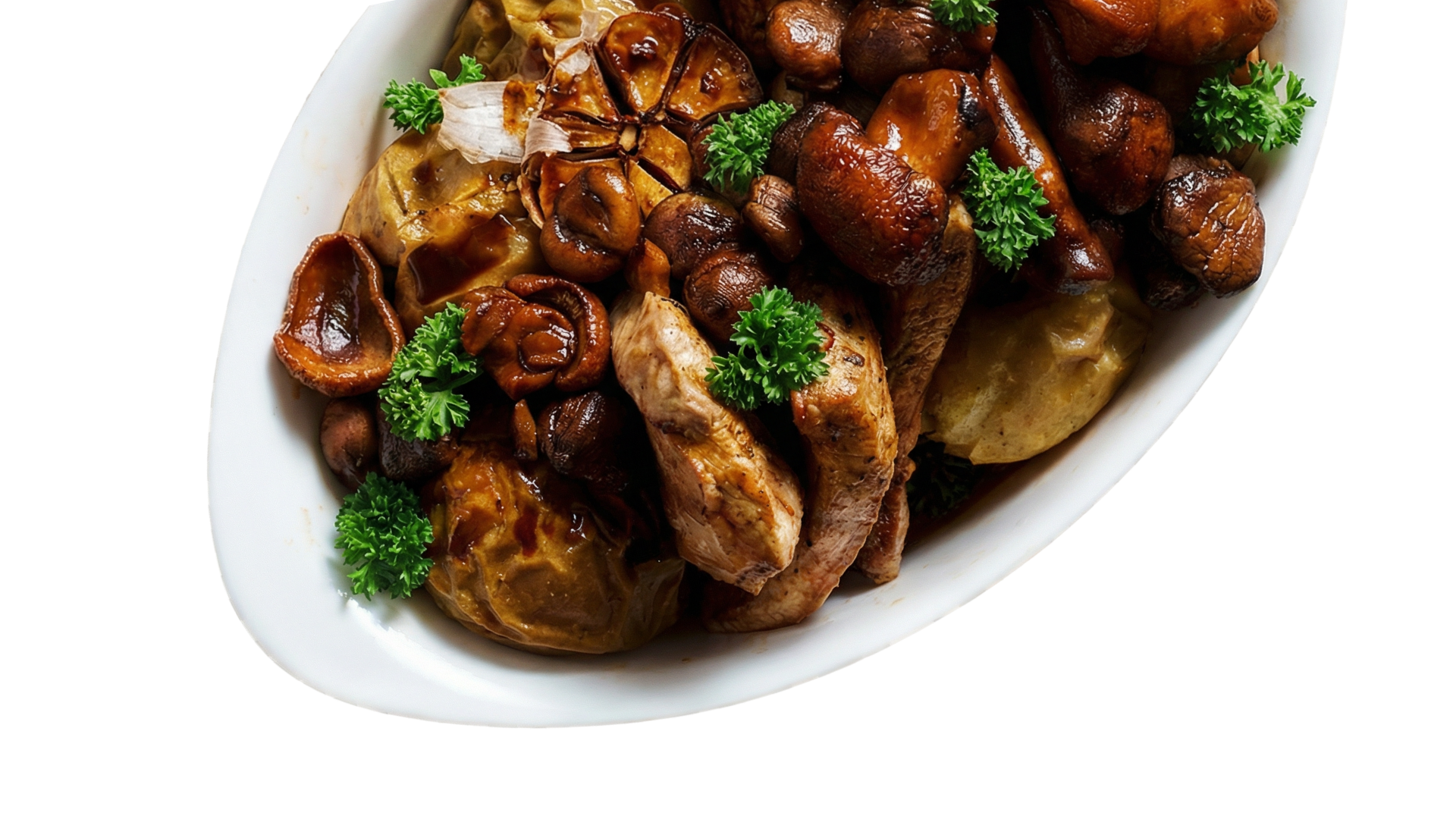 Schab wieprzowy pieczony z jabłkami w ciemnym sosie z borowików i kasztanów