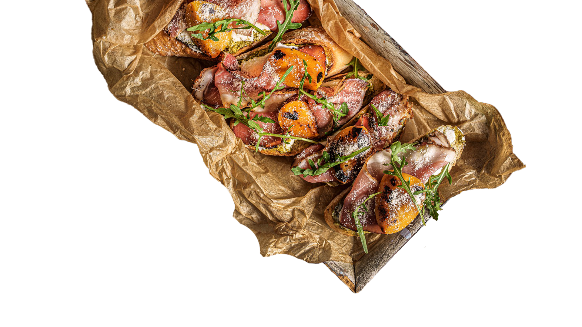 Chrupiące grzanki z dojrzewającą szynką, pesto z rukoli i grillowaną brzoskwinią