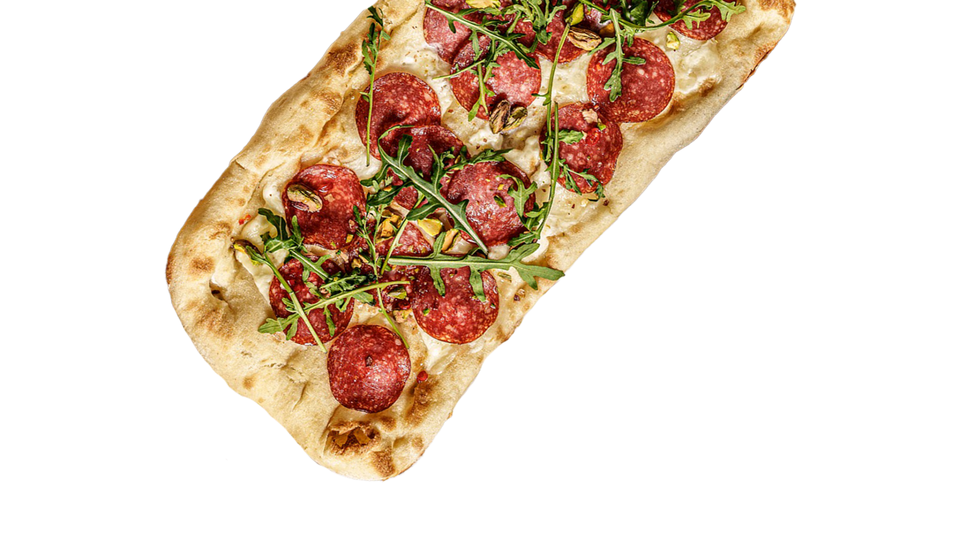 Pinsa z burratą, rukolą i salami czosnkowym
