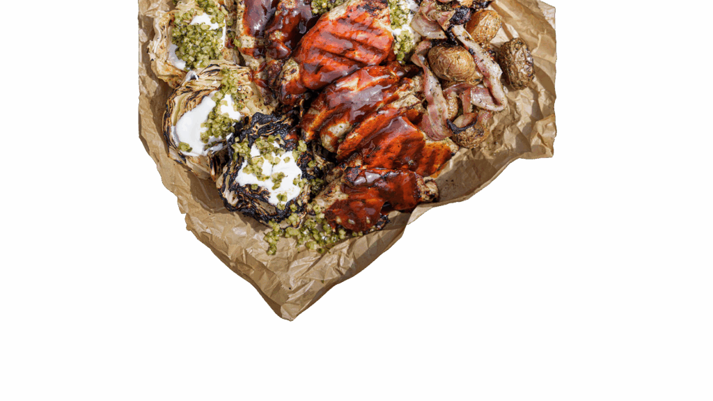Grillowany schab z młodą kapustą, sosem czosnkowo-tahiniowym, salsą z zielonego jabłka i grillowanymi ziemniakami ze słoniną