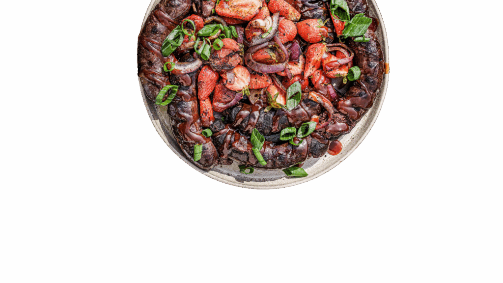 Grillowana kaszanka z grillowanymi truskawkami, czerwoną cebulą i sosem BBQ na whisky