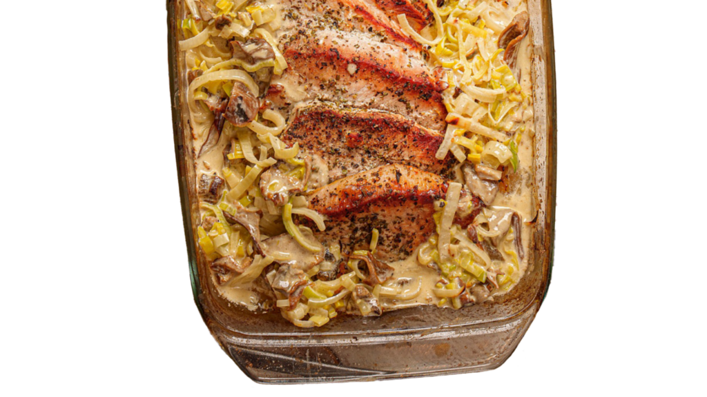 Schab pieczony w porach i śmietanie