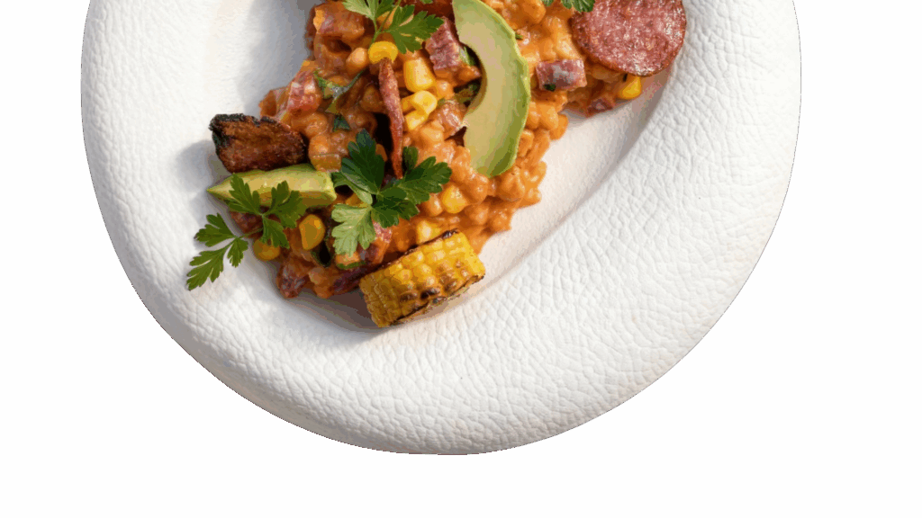 Fasolka po bretońsku w słoiku od Bystrego z kukurydzą, salami i awokado.