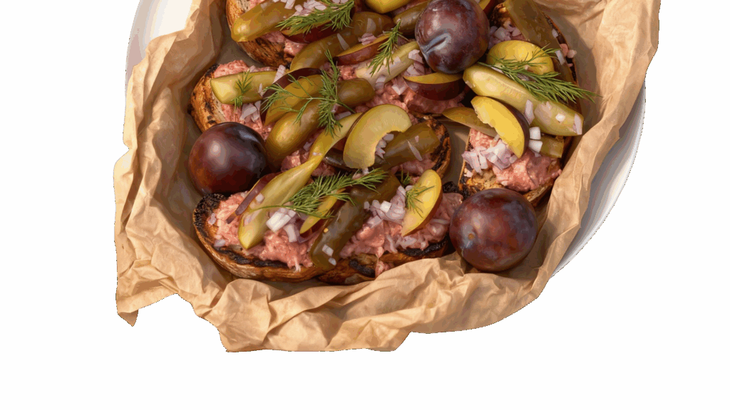 Grzanki z chleba górskiego z metką mistrza Andrzeja, śliwkami węgierkami i czerwoną cebulą
