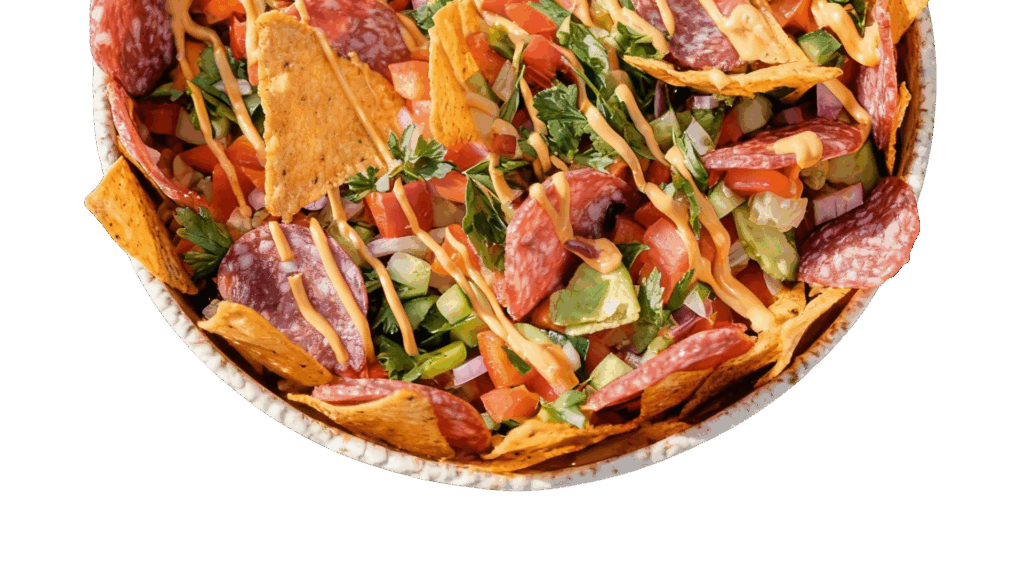 Szybka przekąska z nachosami, salami Bystrego i sałatką z awokado