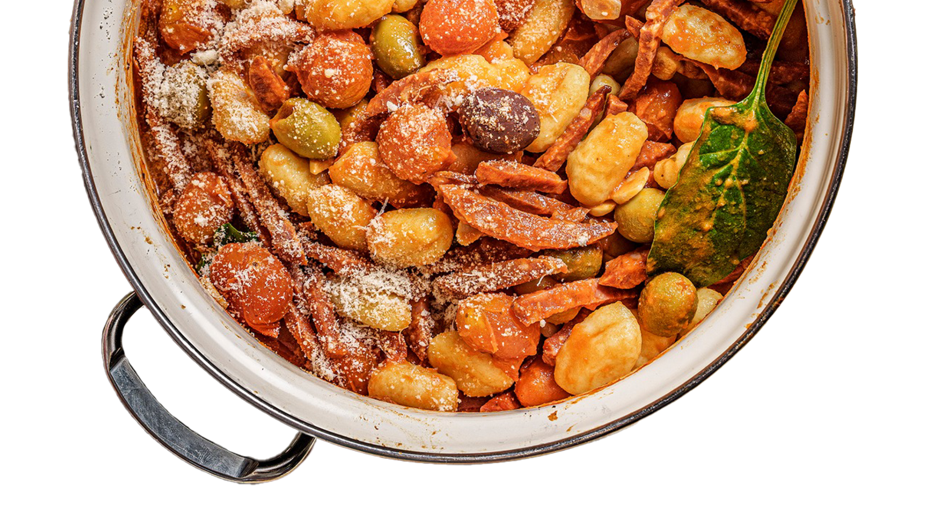 Gnocchi z chorizo Bystry, oliwkami i sosem pomidorowym.