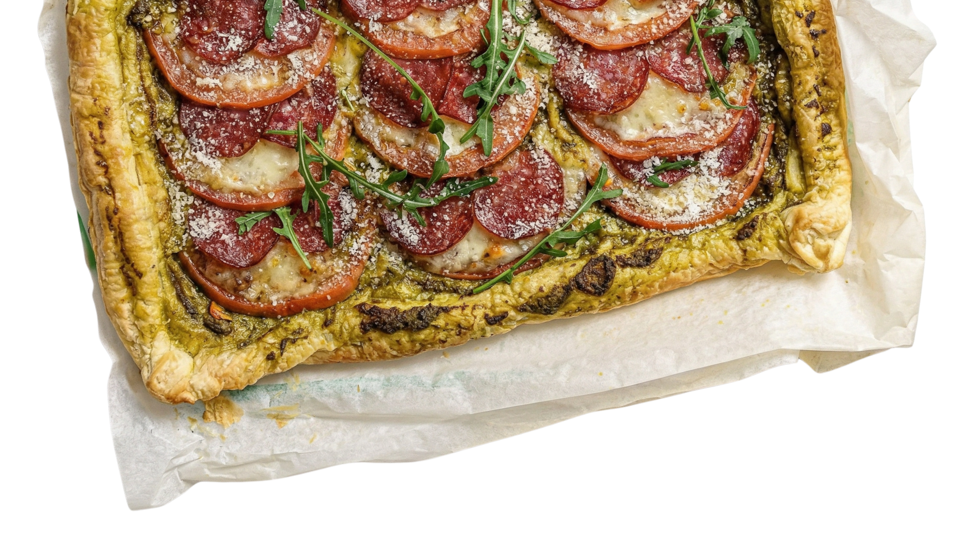 Kruche ciasto z salami czosnkowym, pomidorami, pesto i serami