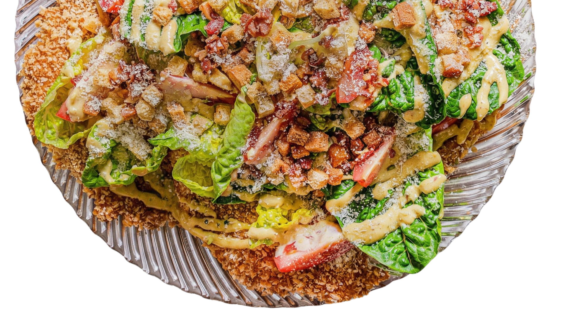 Sałatka Cezar z chrupiącym kurczakiem w panko, boczkiem i pomidorami