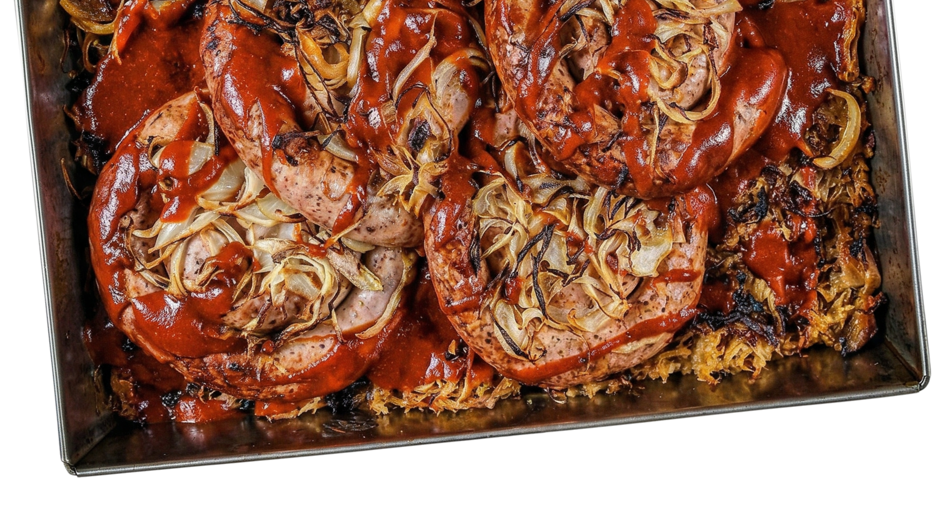 Pieczona kiełbasa z brytfanny – rumianą, soczystą, na miękkiej, lekko podpieczonej kiszonej kapuście