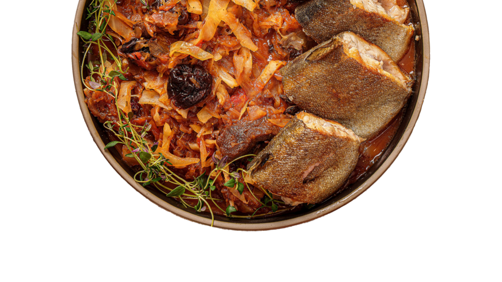 Świąteczny bigos rybny z pstrągiem, grzybami i śliwkami