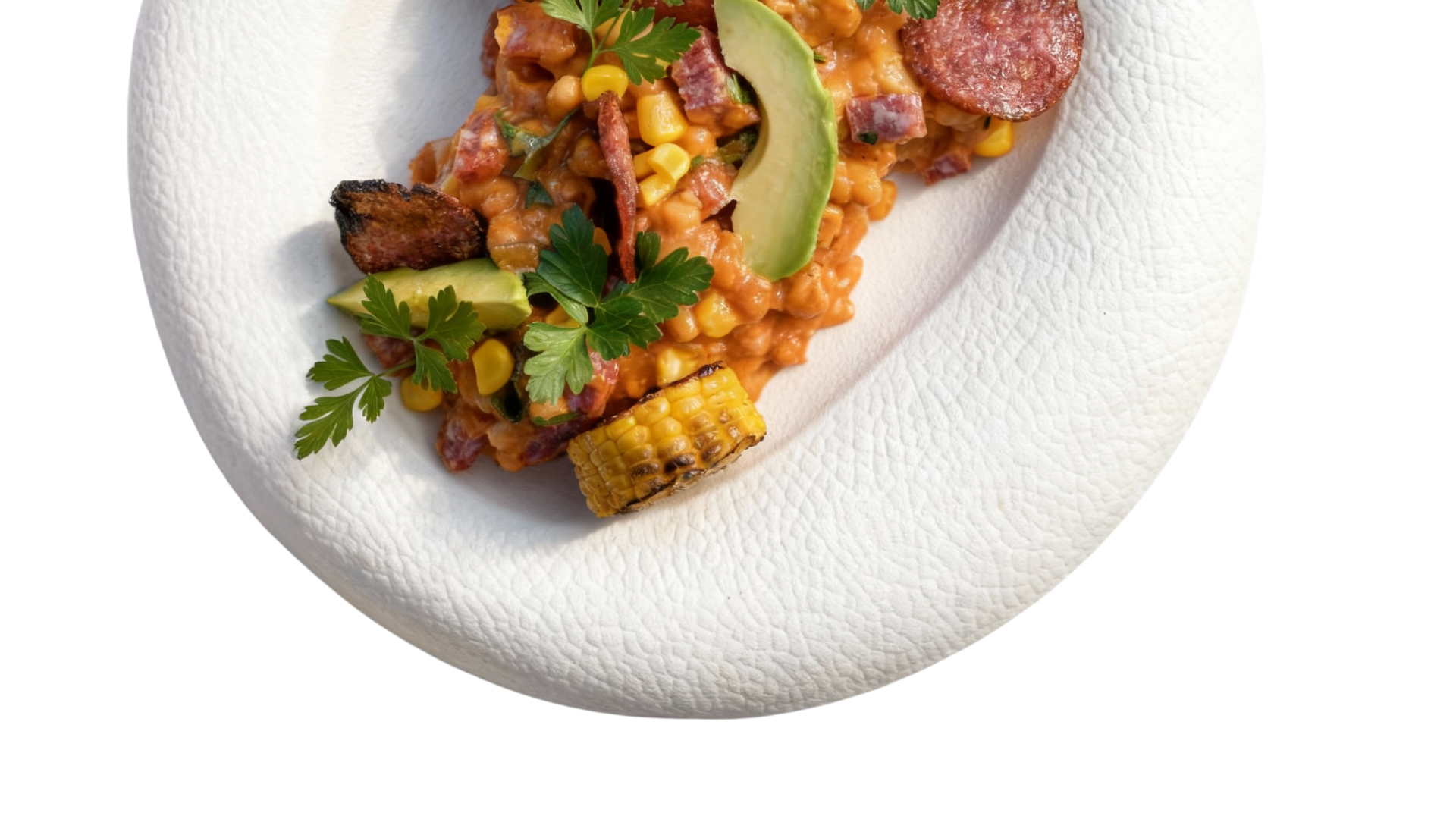 Fasolka po bretońsku w słoiku od Bystrego z kukurydzą, salami i awokado.