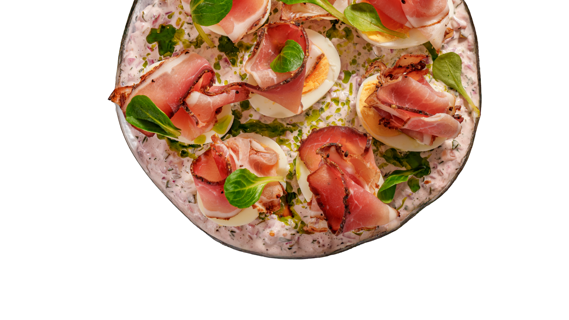 • Na wierzchu każdej połówki jajka ułóż cienki plaster dojrzewającej szynki od Bystrego, delikatnie układając go w lekko falującą formę.