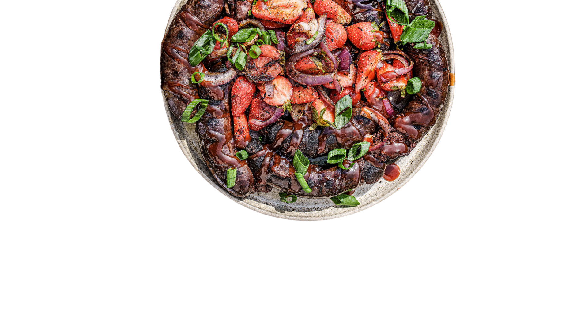 Grillowana kaszanka z grillowanymi truskawkami, czerwoną cebulą i sosem BBQ na whisky