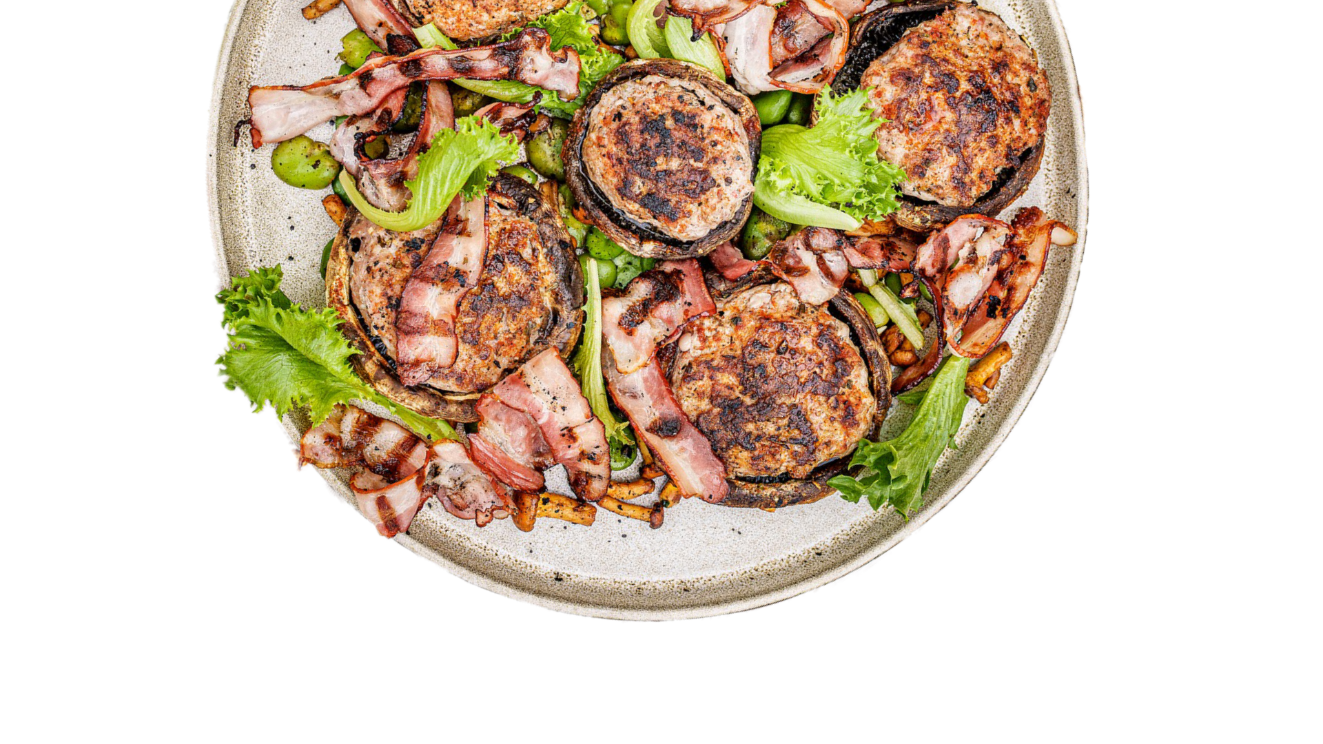 Grillowane pieczarki portobello nadziewane mięsem mielonym od Bystrego, na bobie z kurkami i grillowanym boczkiem