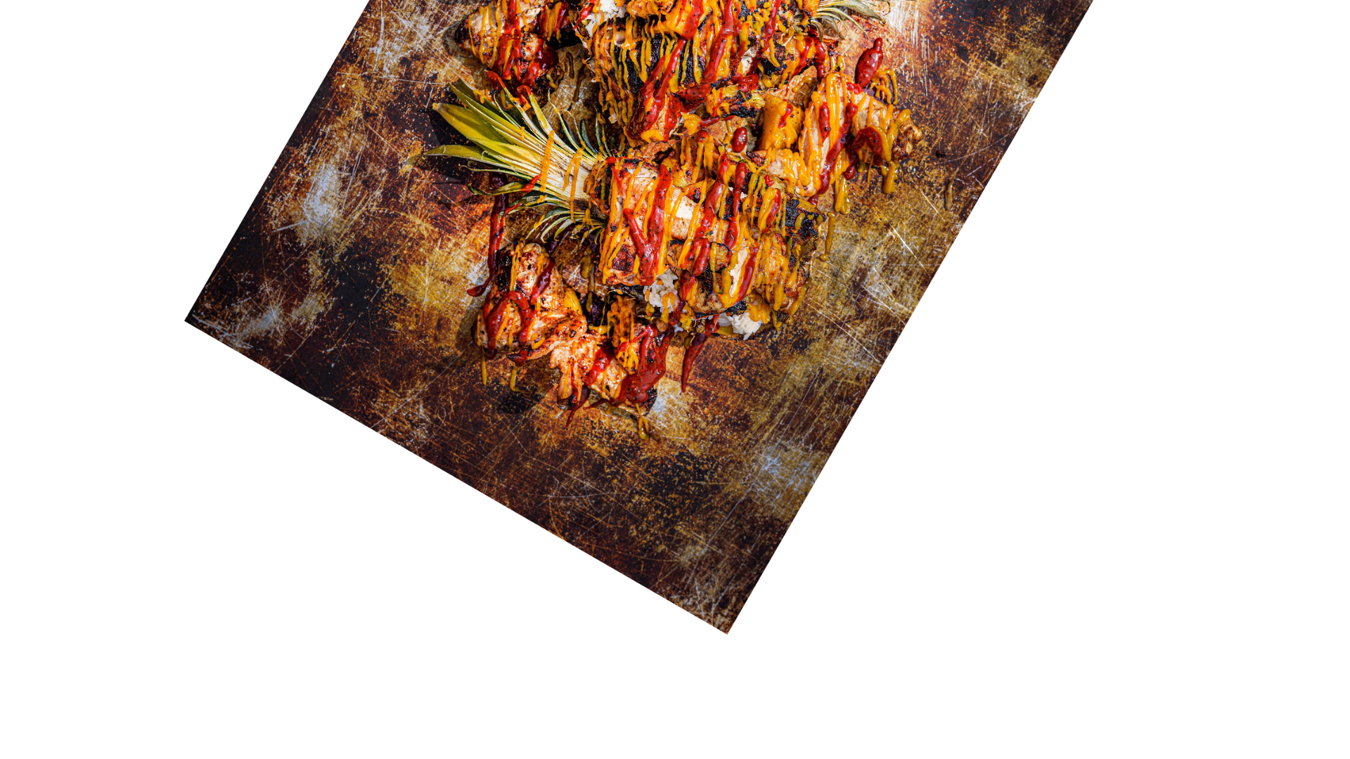 Połówki ananasa wypełnij skrzydełkami i grillowanym ananasem. Polej wszystko dwoma sosami.