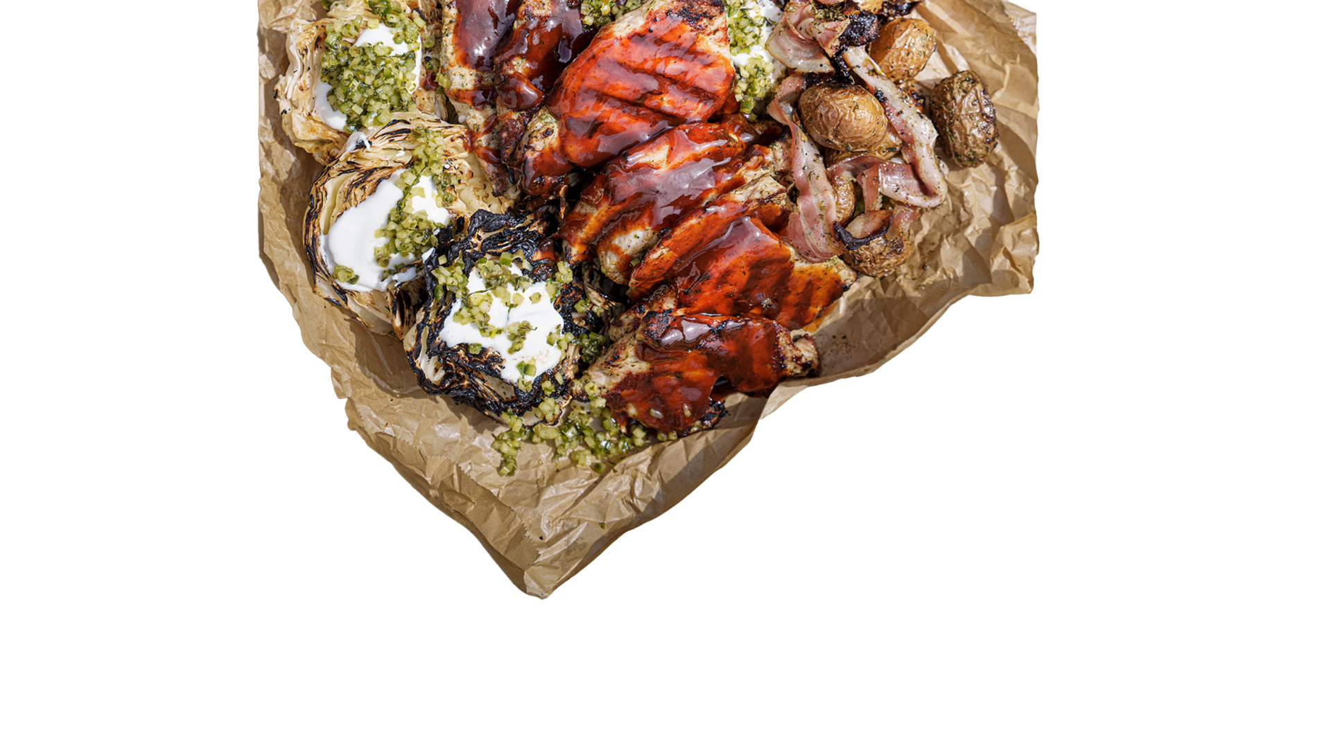 Grillowany schab z młodą kapustą, sosem czosnkowo-tahiniowym, salsą z zielonego jabłka i grillowanymi ziemniakami ze słoniną