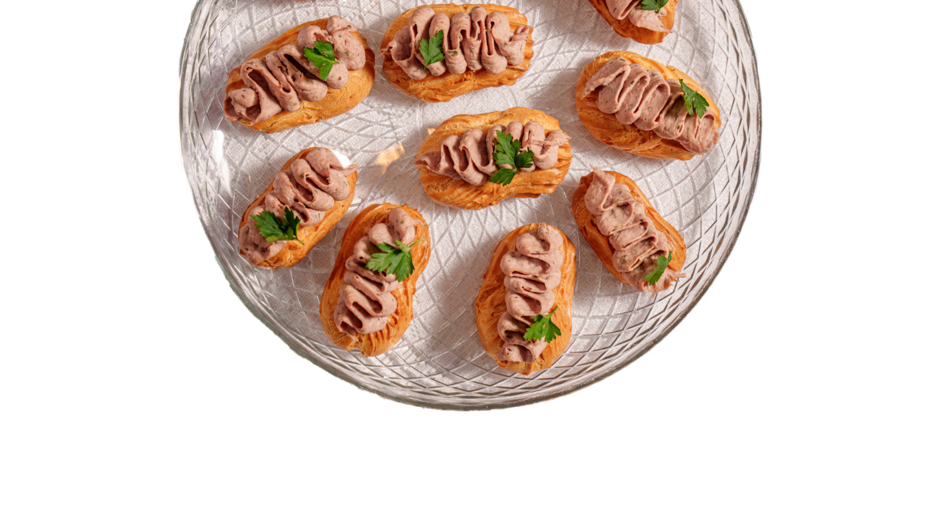 • Delikatnie wciśnij końcówkę w górną część każdego eklerka i naciskając, wypełnij je kremową leberką. Nadzienie powinno być widoczne na powierzchni, tworząc apetyczny, wyrazisty wierzch.
