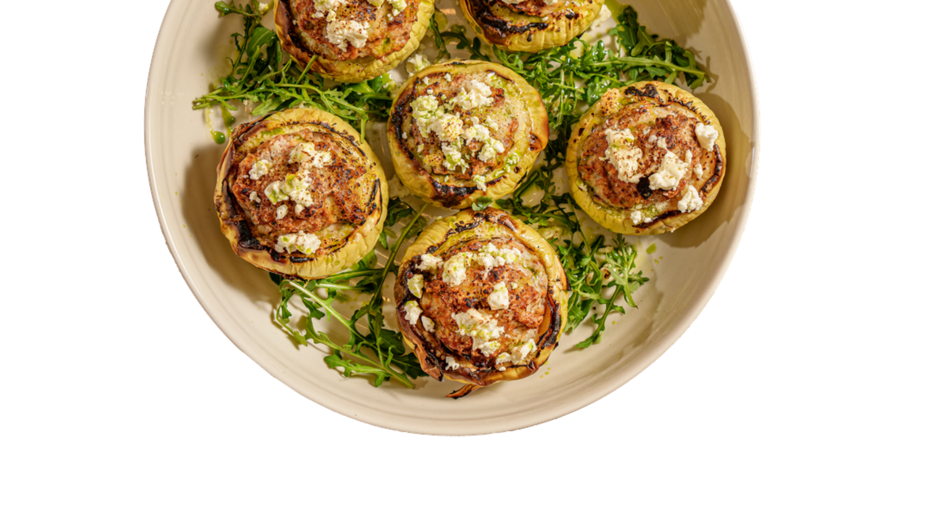 Pieczona kalarepa nadziewana mięsem mielonym od Bystrego z owczym serem, rukolą i suszonymi pomidorami