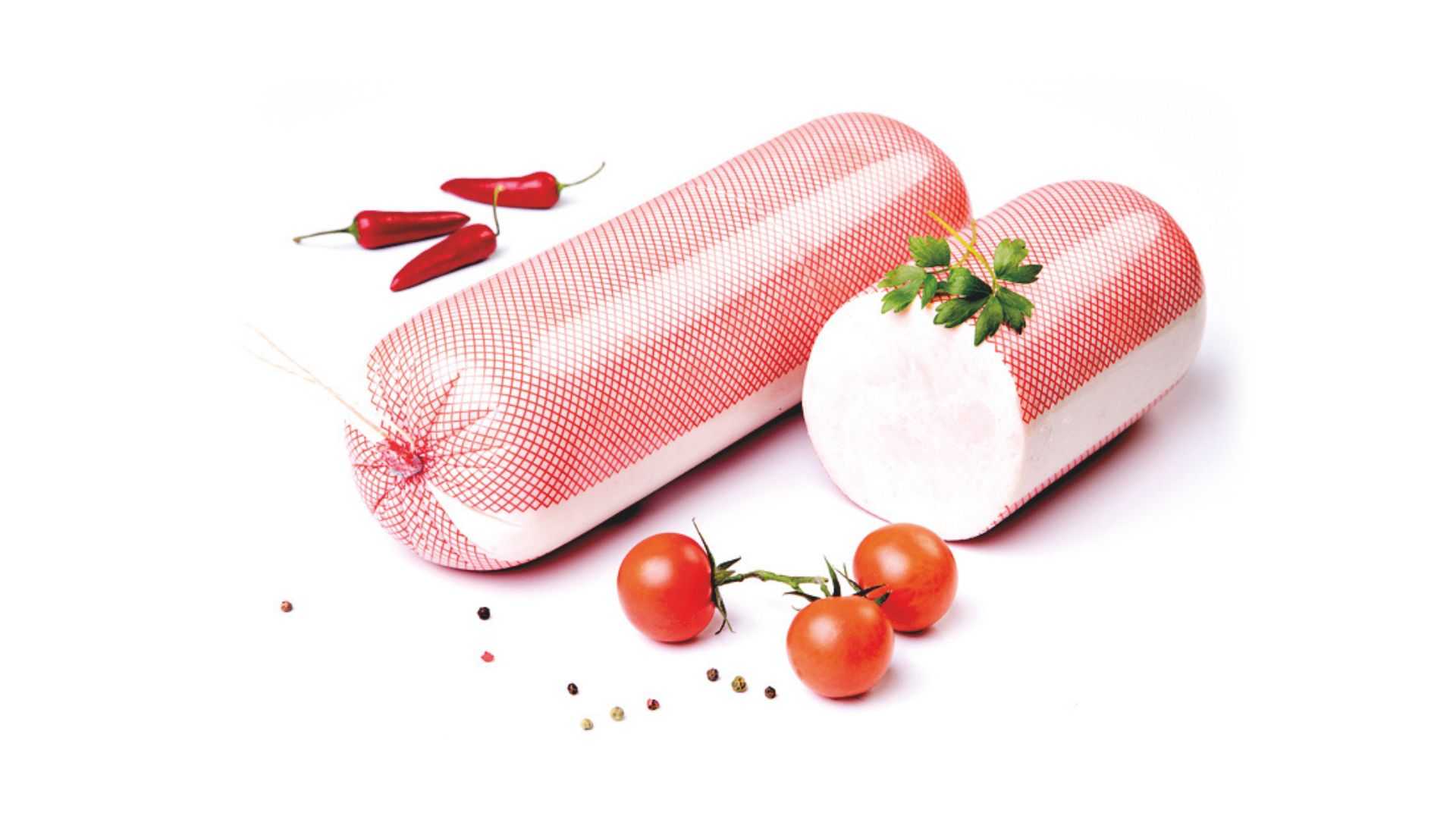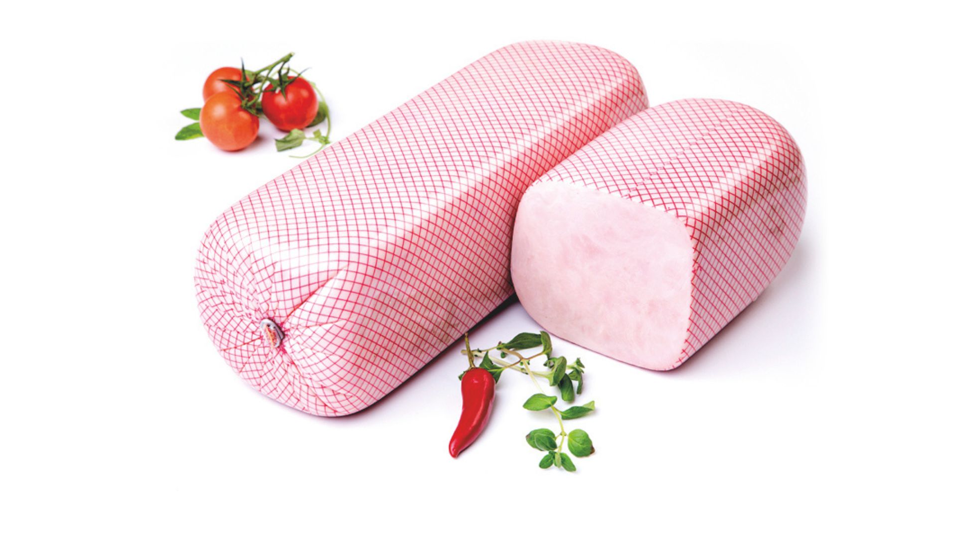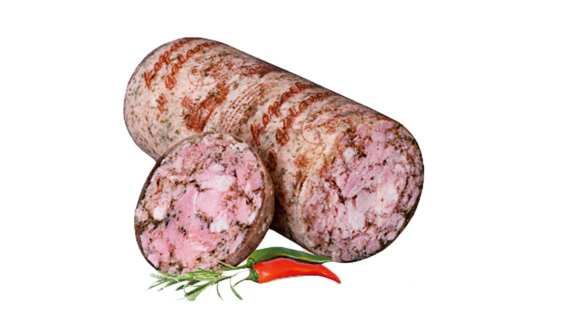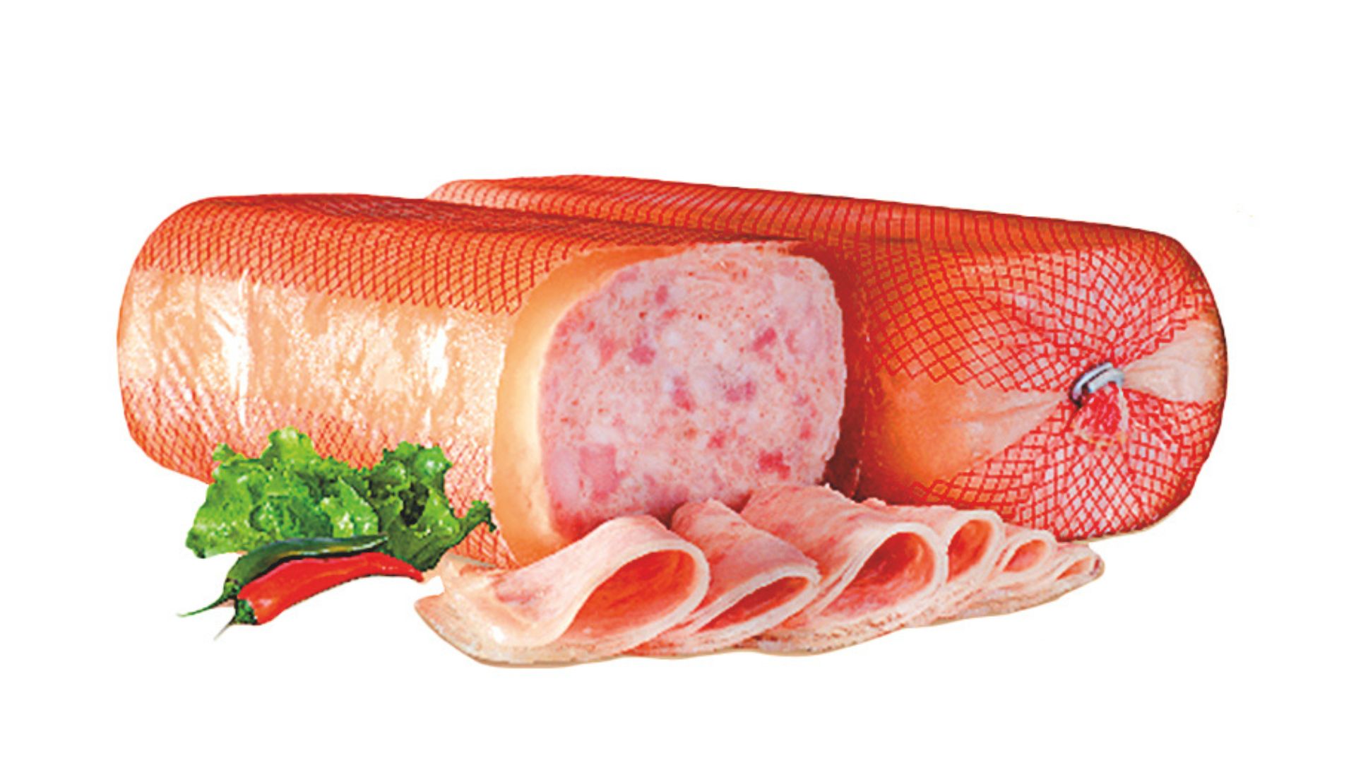 nadziewany w sztuczne osłonki. Formowany w bloki o masie ok. 3,5 kg. Wyrób