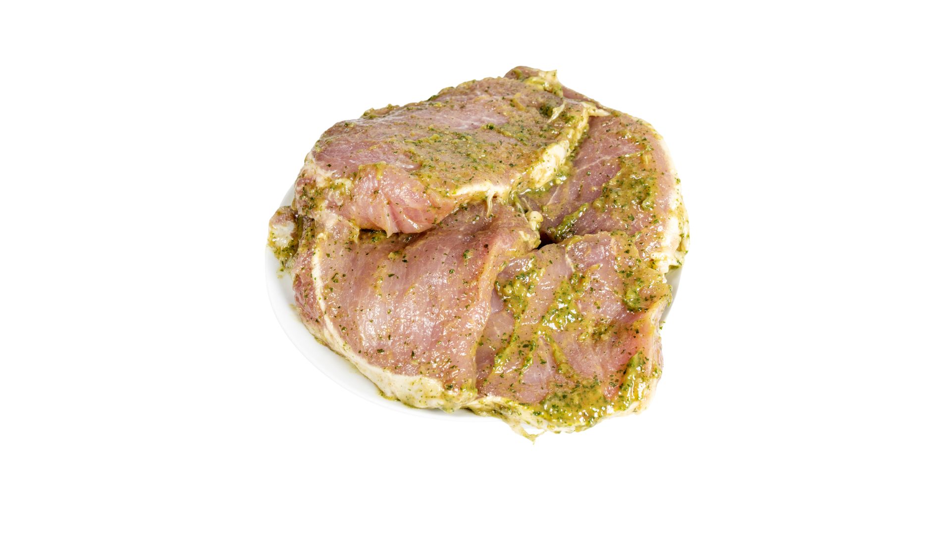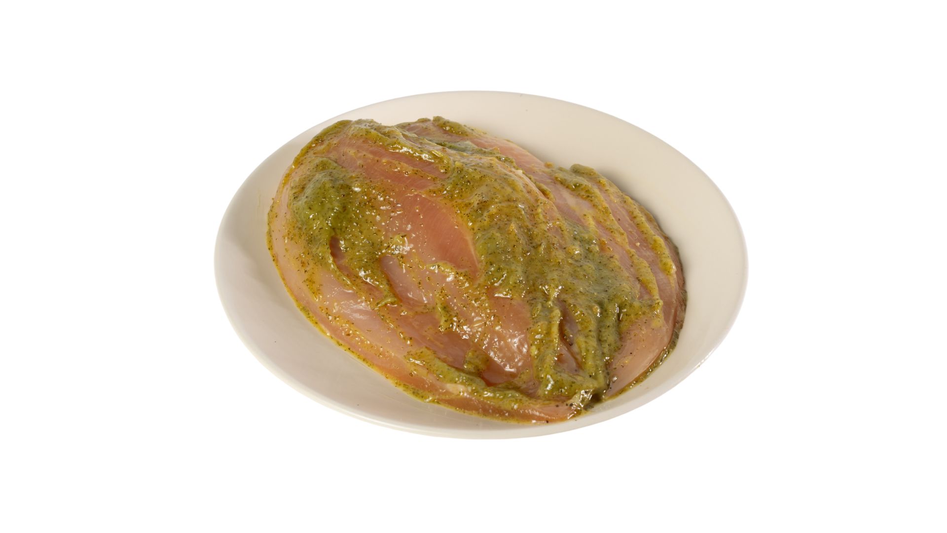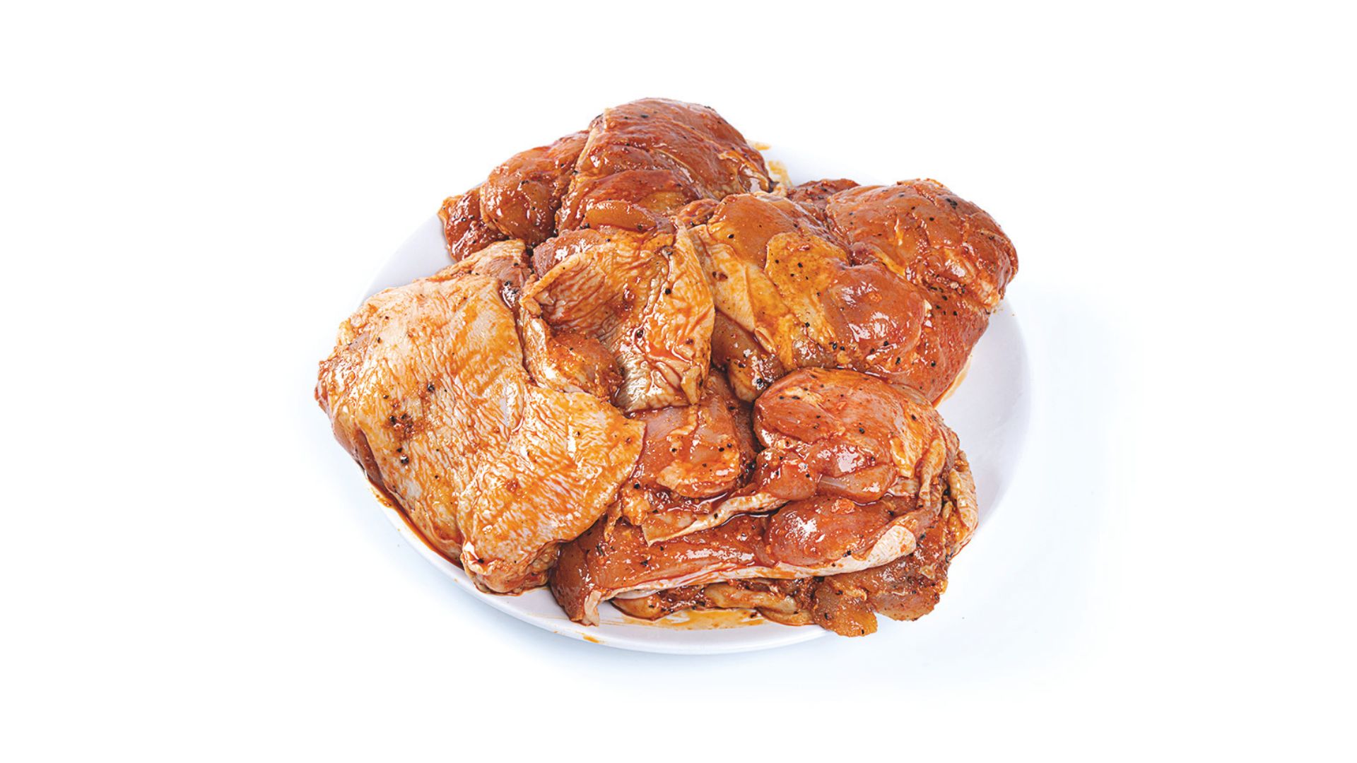 Surowe udko z kurczaka bez kości zew skórą połączone z marynatą olejową, przeznaczone do celów kulinarnych. Dominujący smak papryki, czosnku i imbiru. Pakowane VAC