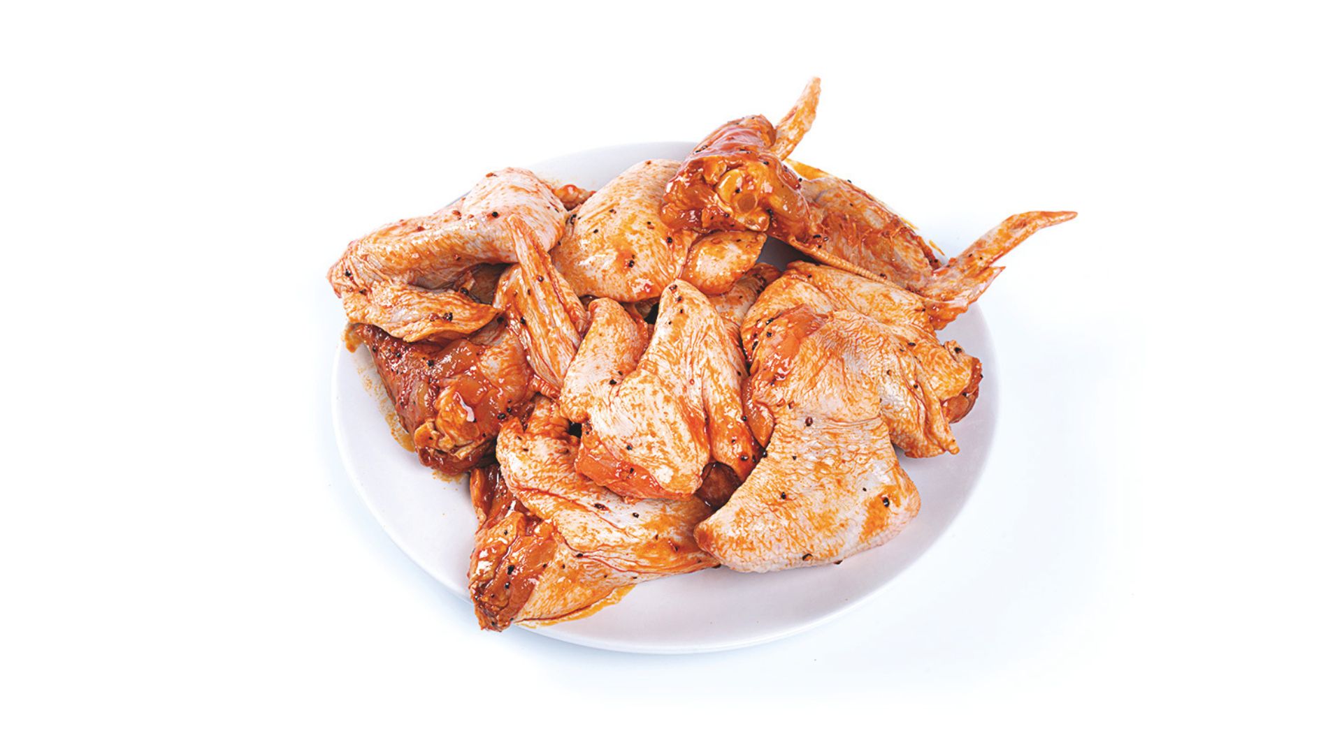 Surowe podudzie z kurczaka połączone z marynatą olejową, przeznaczone do celów kulinarnych. Kolor marynaty czerwono-pomarańczowy. Dominujący smak papryki. Pakowane VAC
