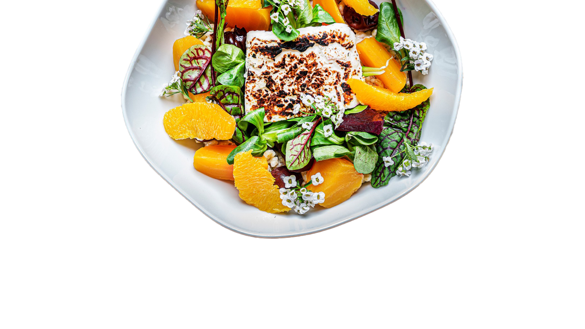 Sałatka z kaszy pęczak z sosem winegret, pieczonymi burakami, pomarańczami, słonecznikiem, czereśniami i serem halloumi