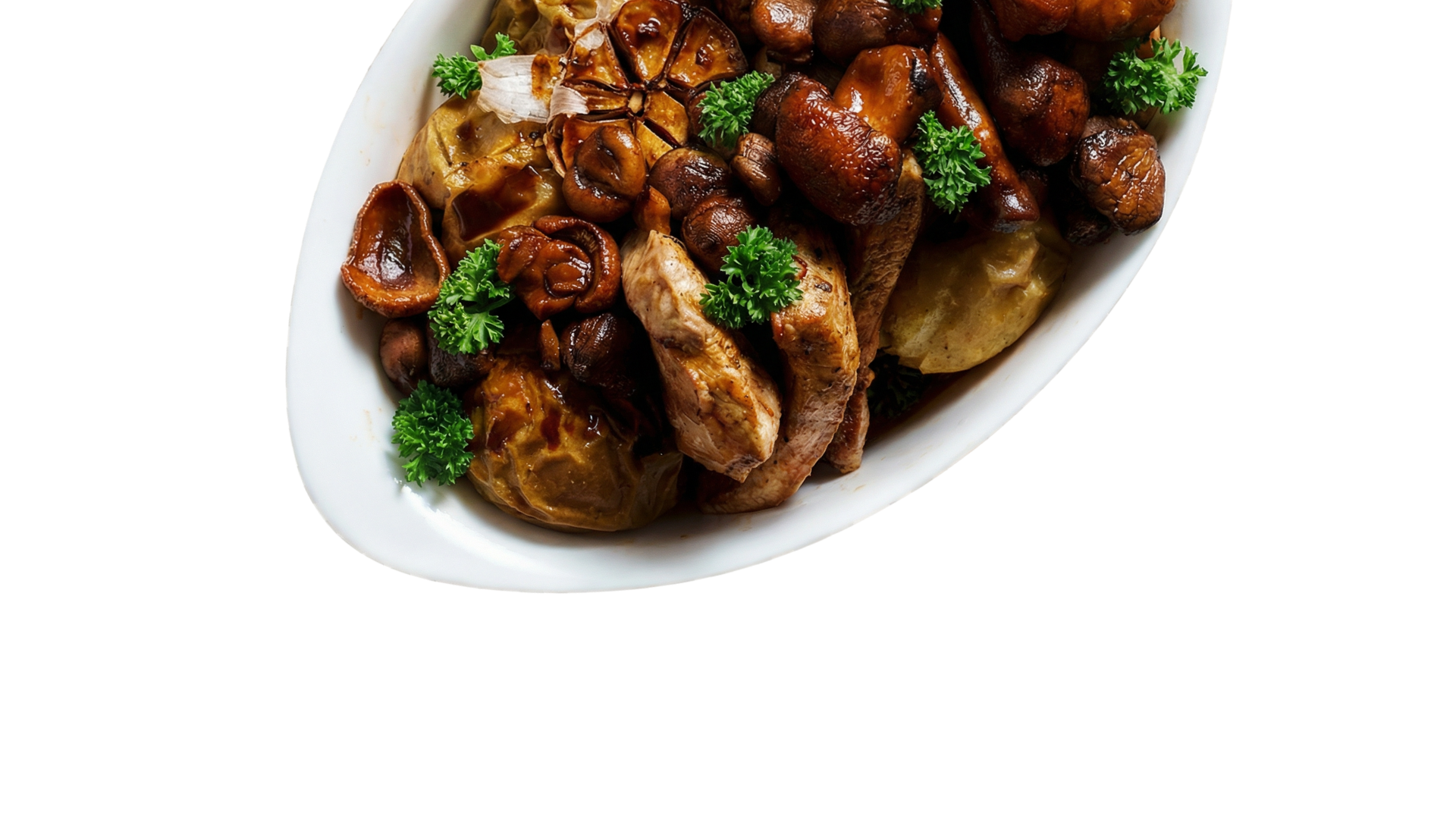 Schab wieprzowy pieczony z jabłkami w ciemnym sosie z borowików i kasztanów