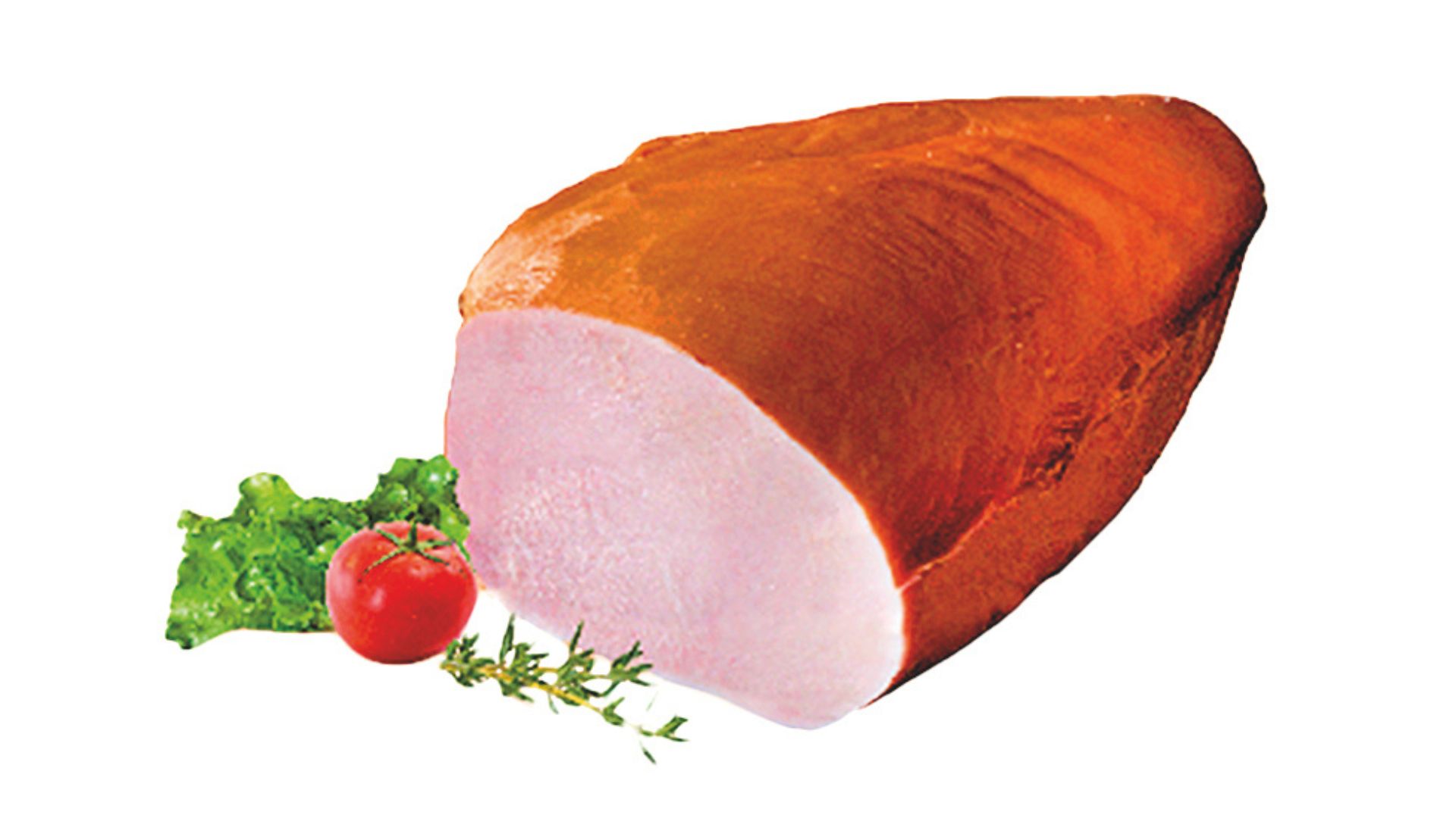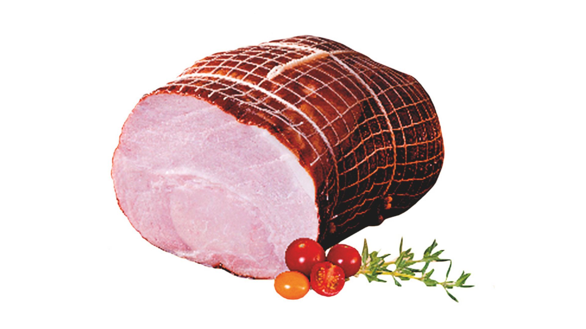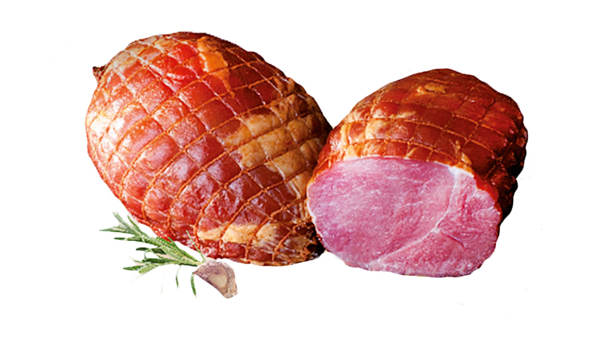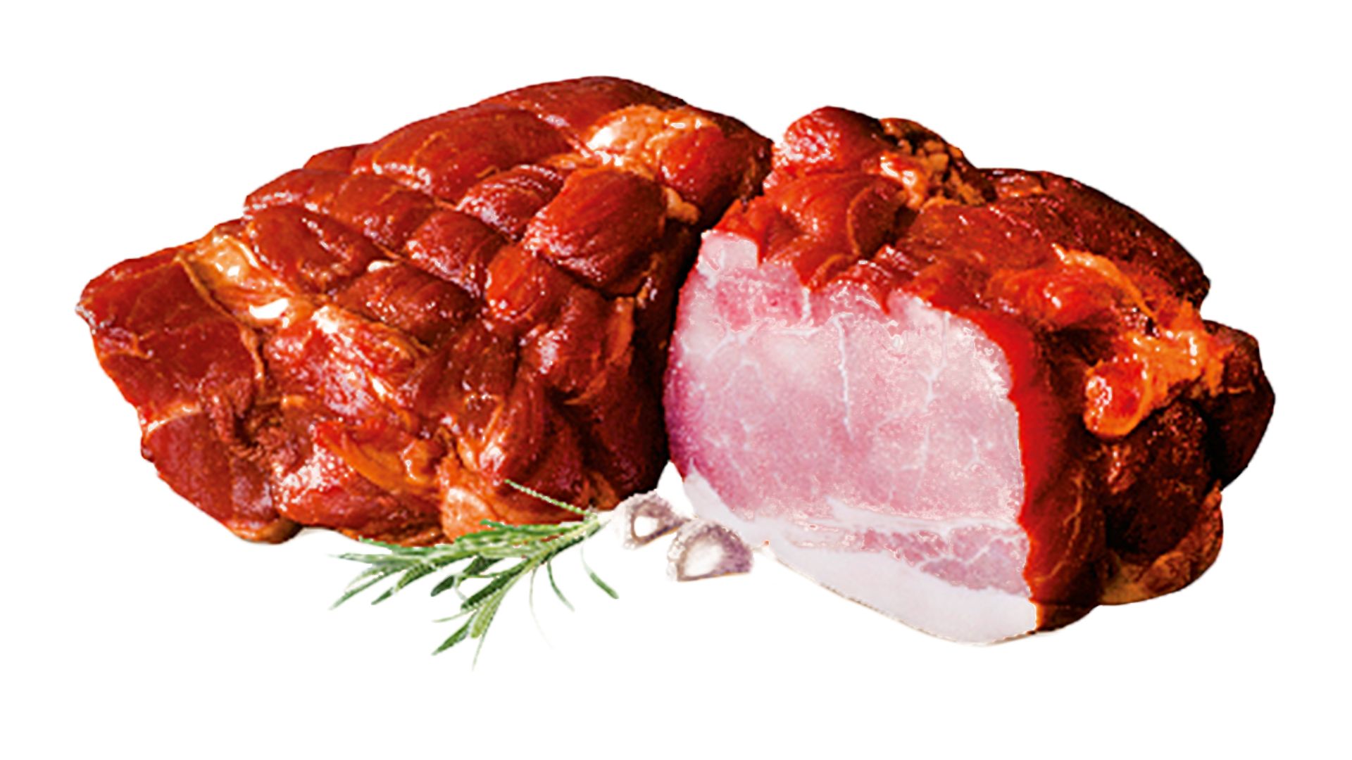 Szynka wędzona, parzona. Widoczne ślady po sznurowaniu. Szynka dobrze krajalna z delikatną okrywą tłuszczową. Na przekroju różowa.