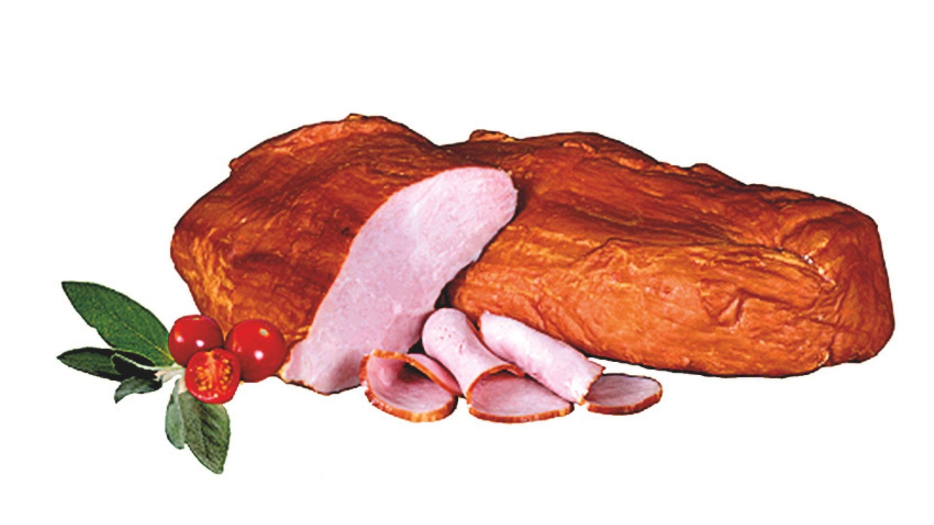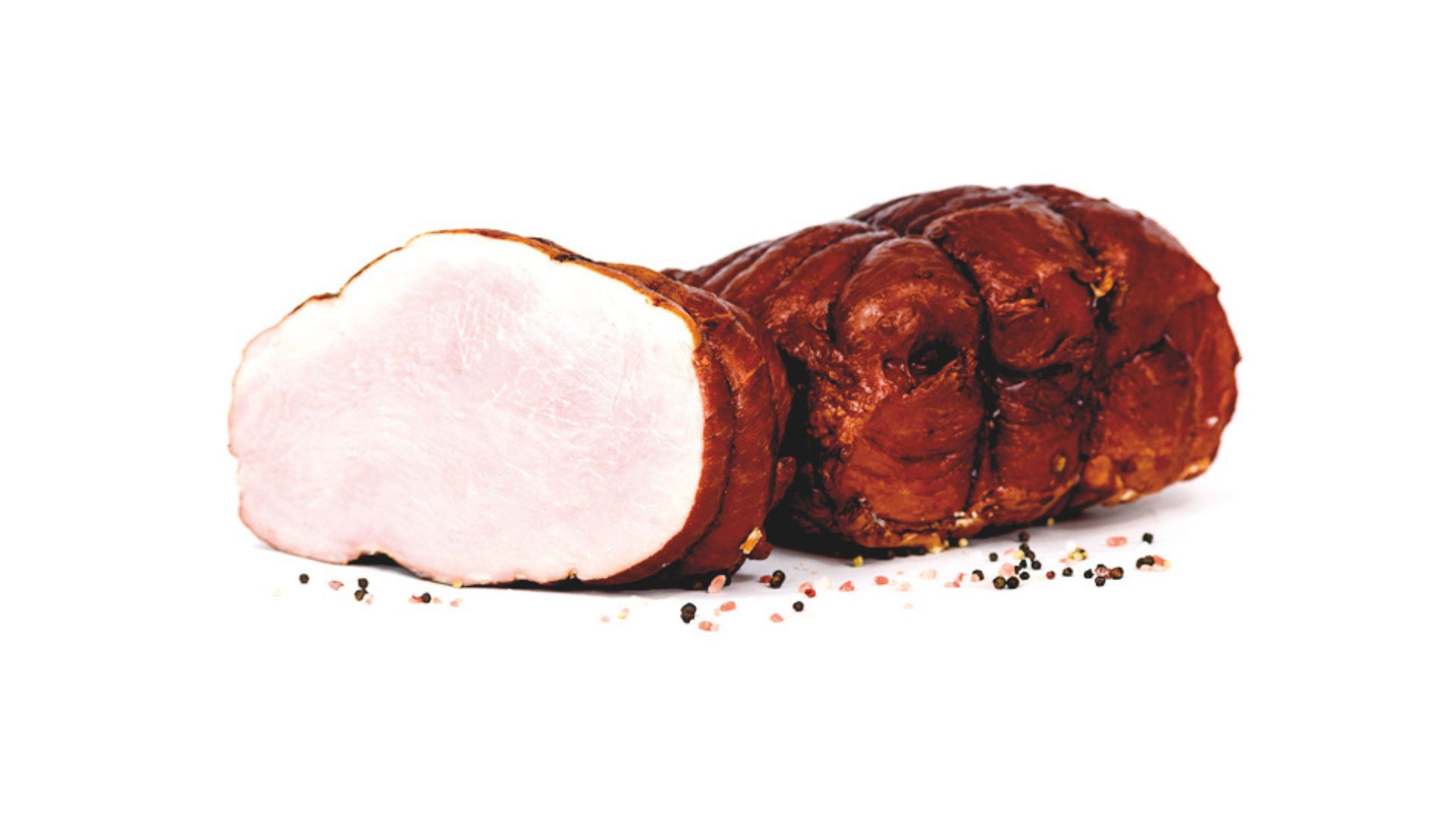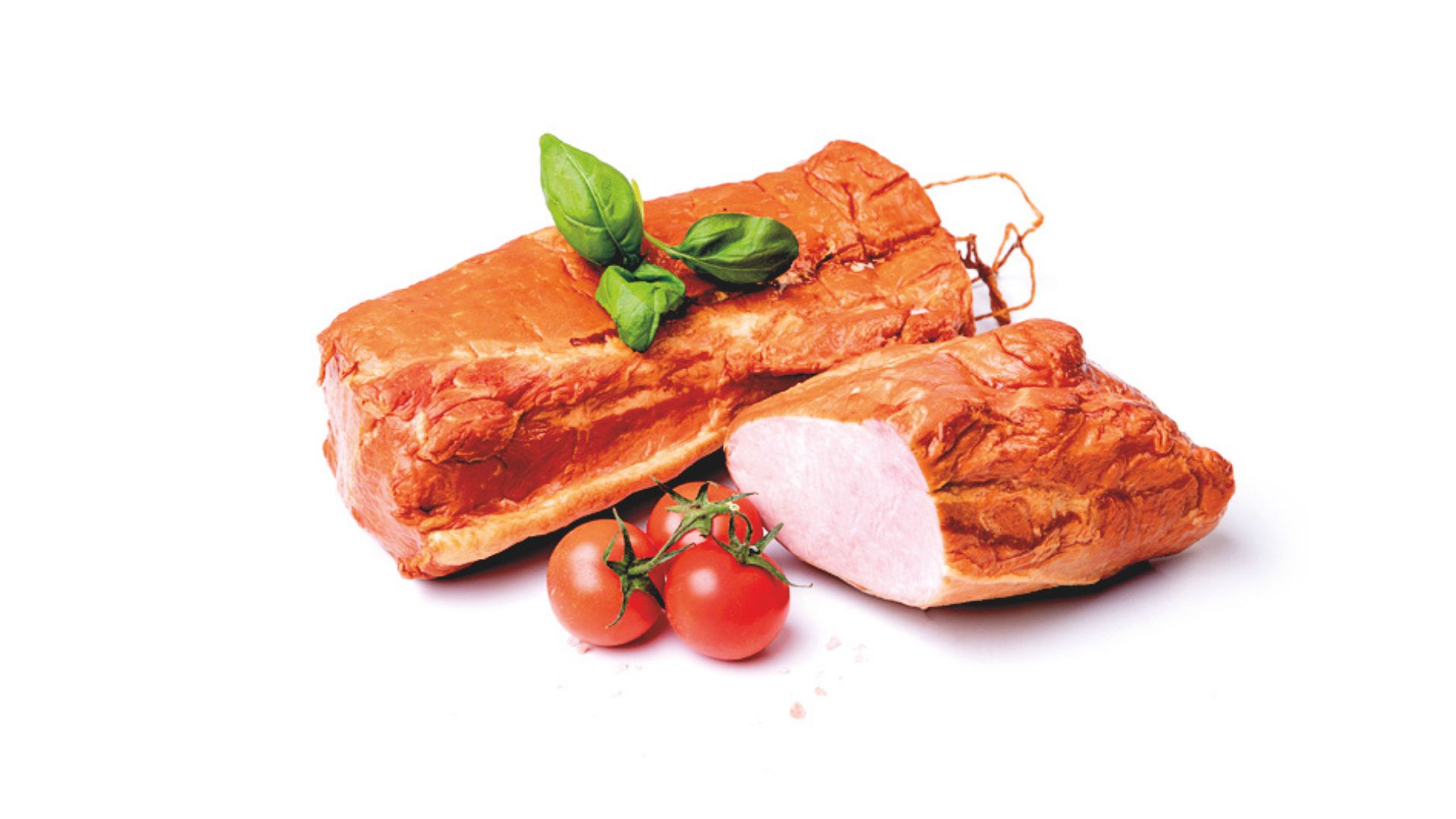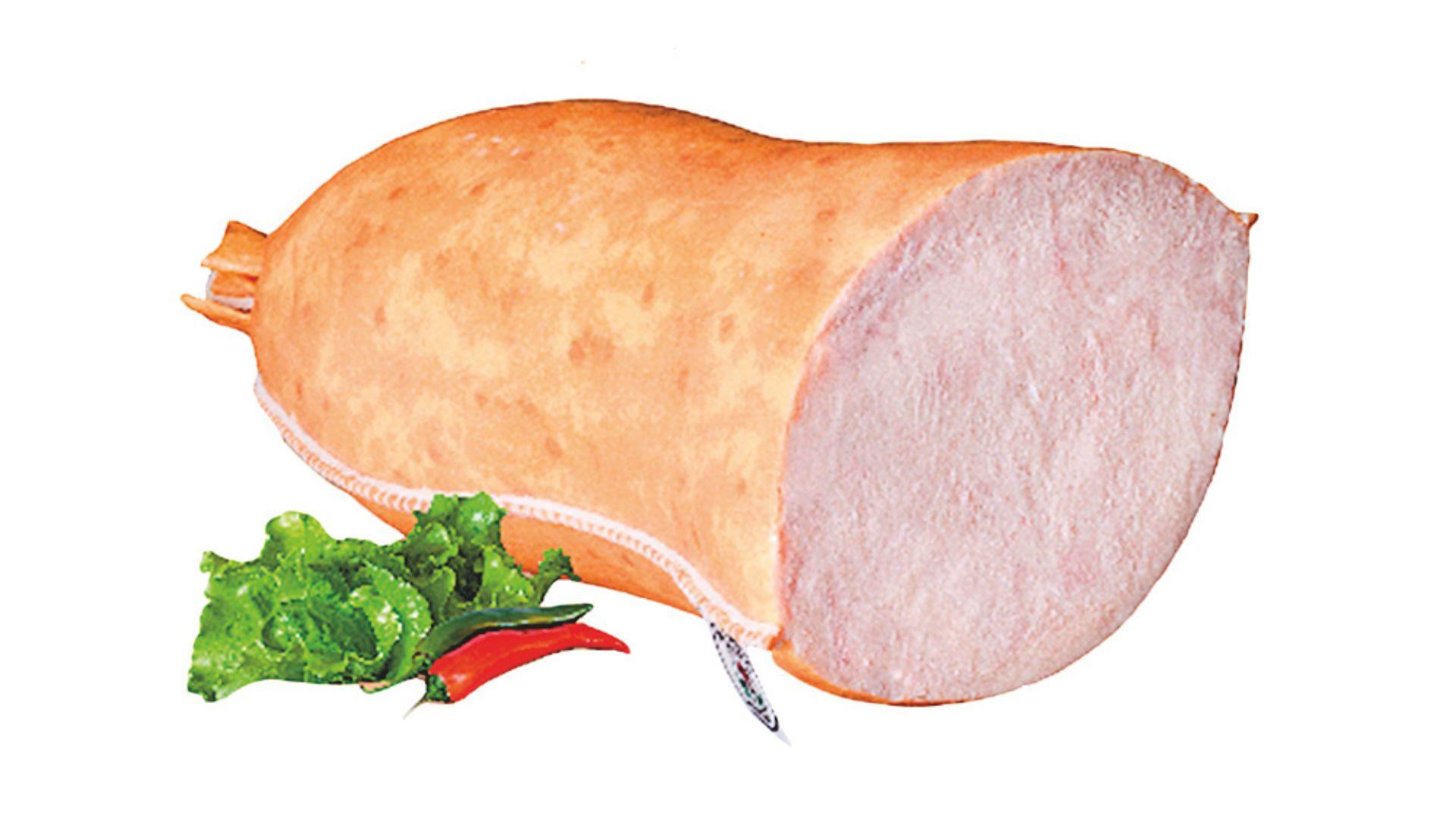 Szynka wędzona, parzona. Widoczne ślady po sznurowaniu. Szynka dobrze krajalna z delikatną okrywą tłuszczową. Na przekroju różowa.
