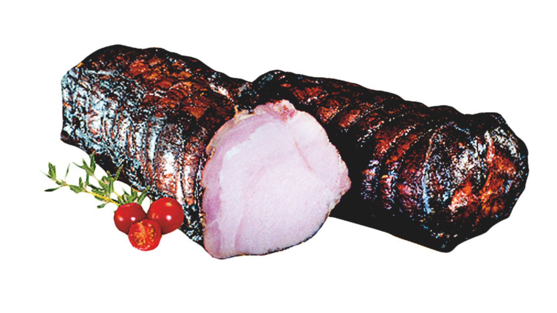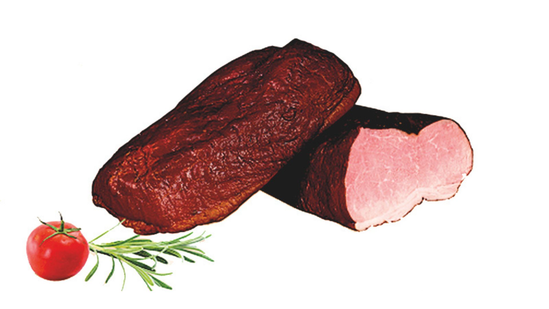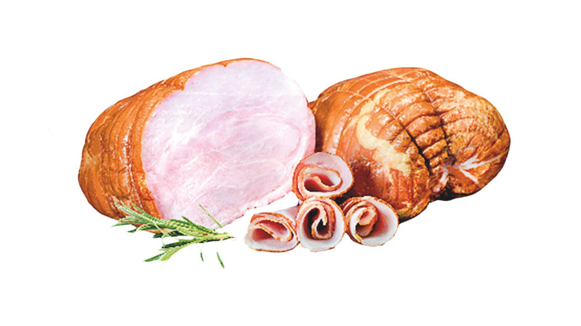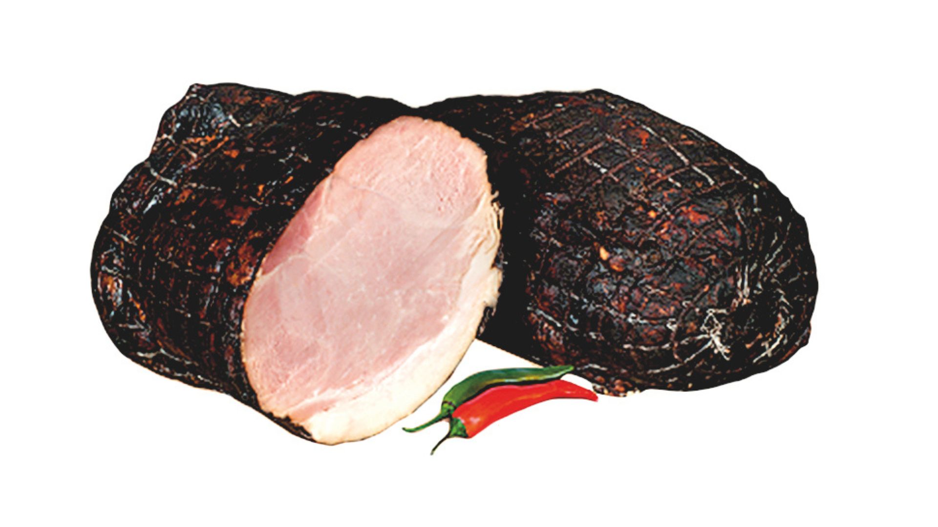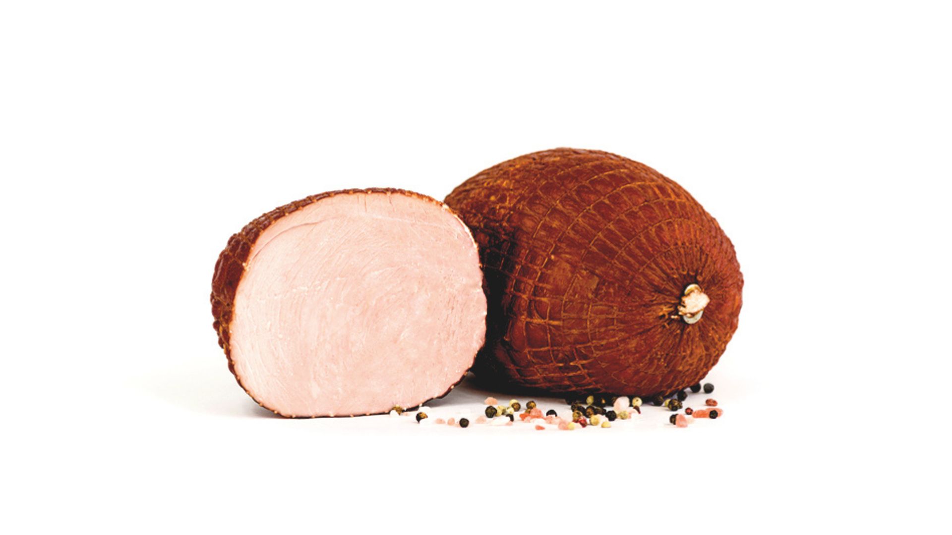 Szynka wędzona, parzona. Widoczne ślady po sznurowaniu. Szynka dobrze krajalna z delikatną okrywą tłuszczową. Na przekroju różowa.