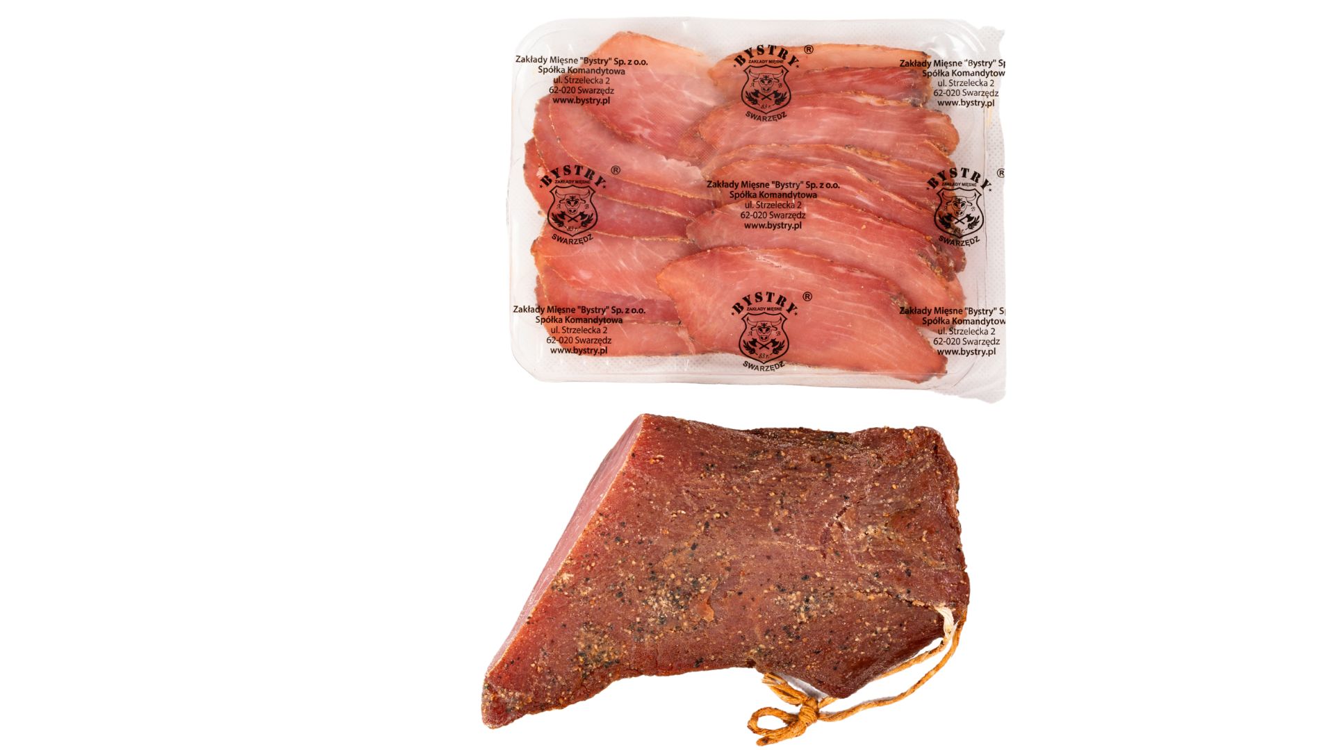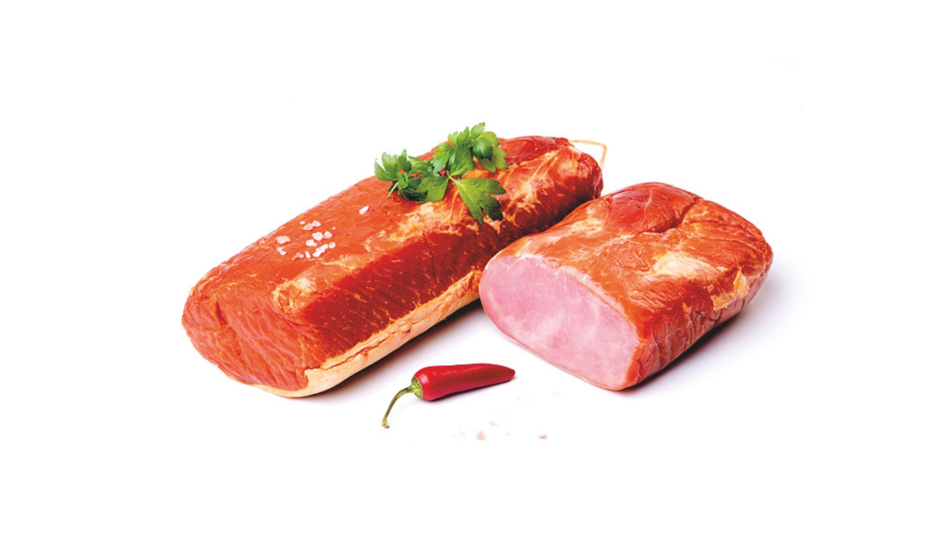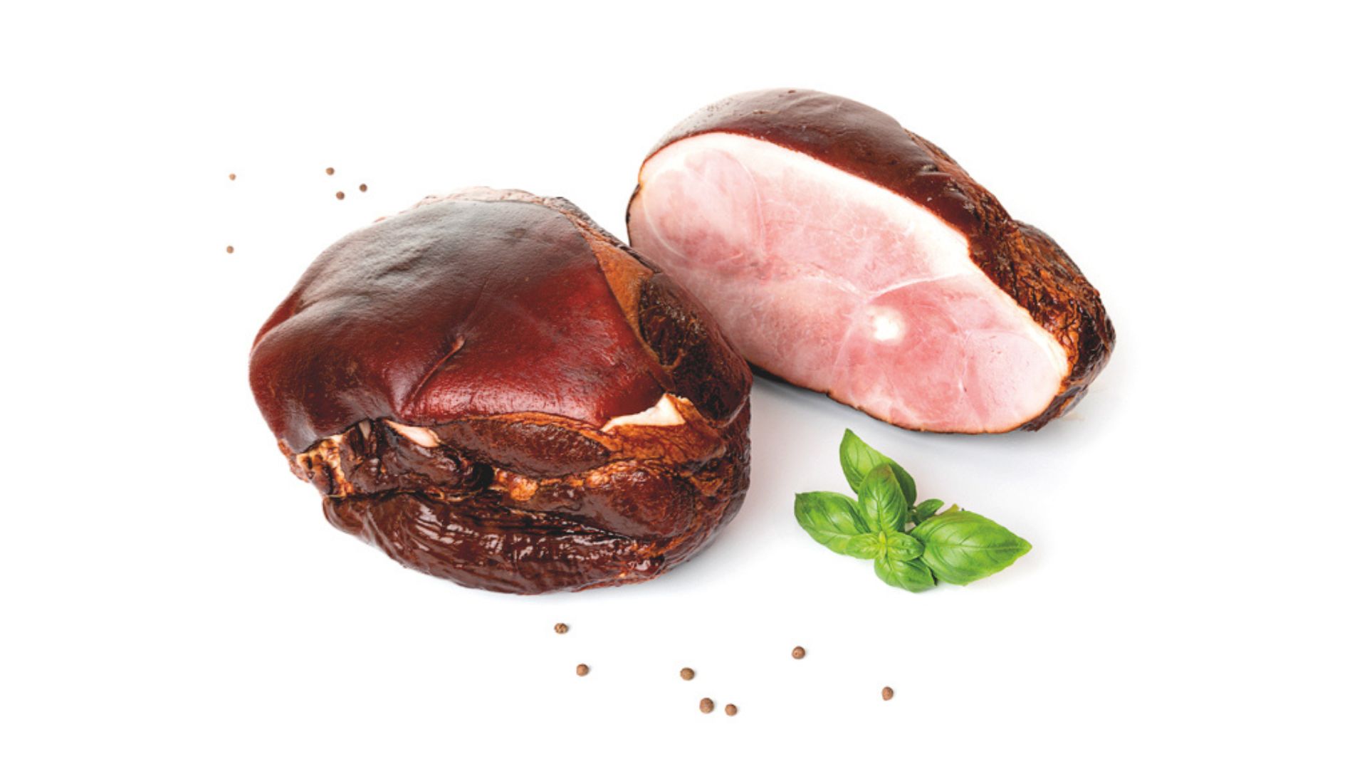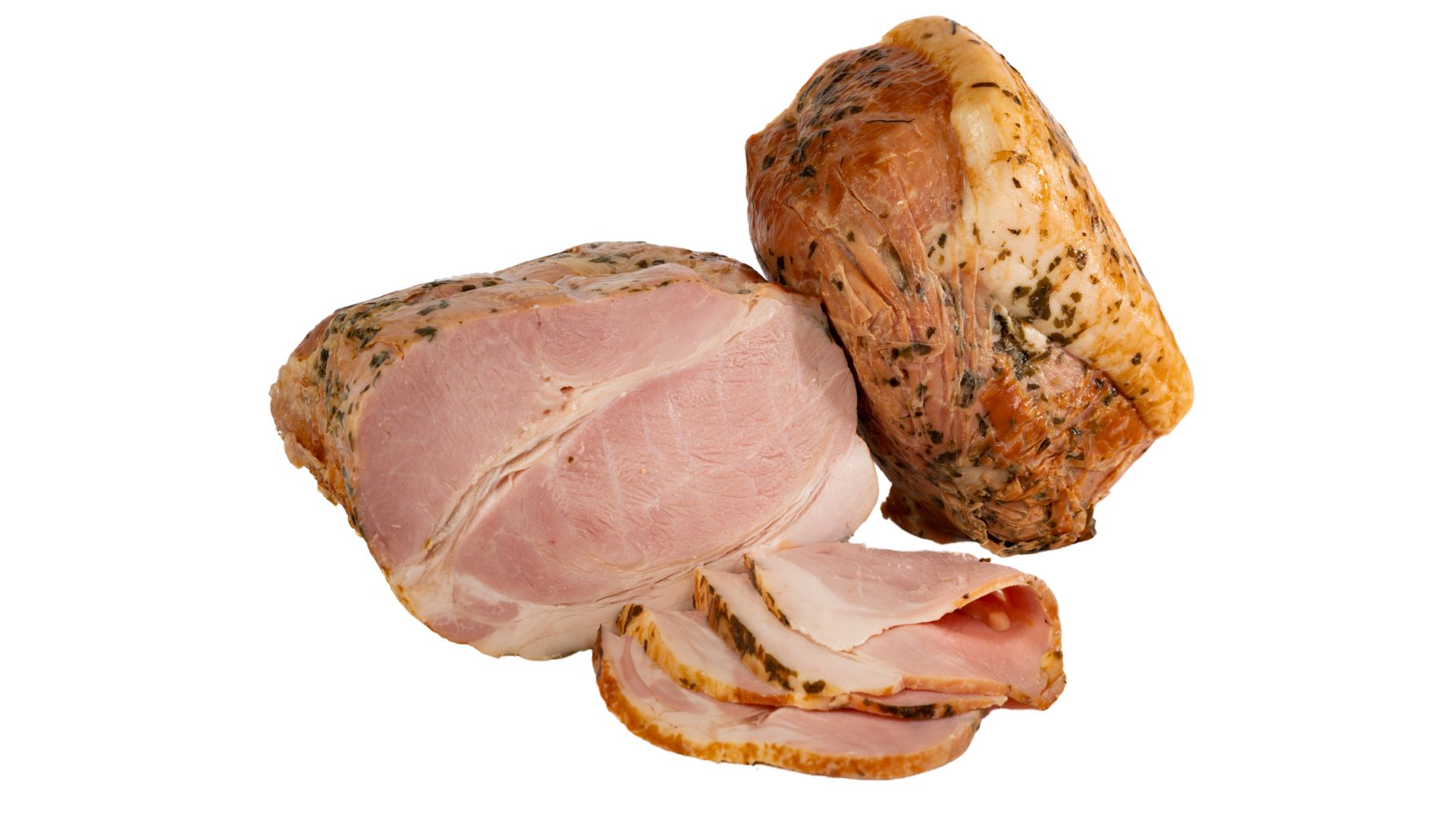 Szynka wędzona, parzona. Widoczne ślady po sznurowaniu. Szynka dobrze krajalna z delikatną okrywą tłuszczową. Na przekroju różowa.