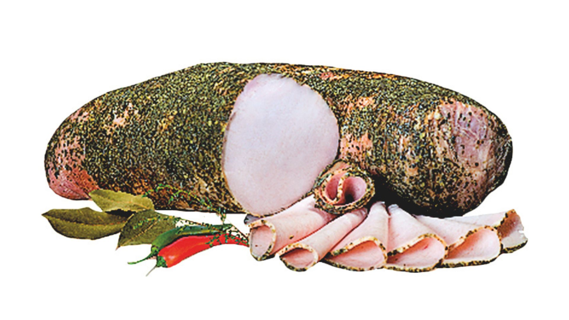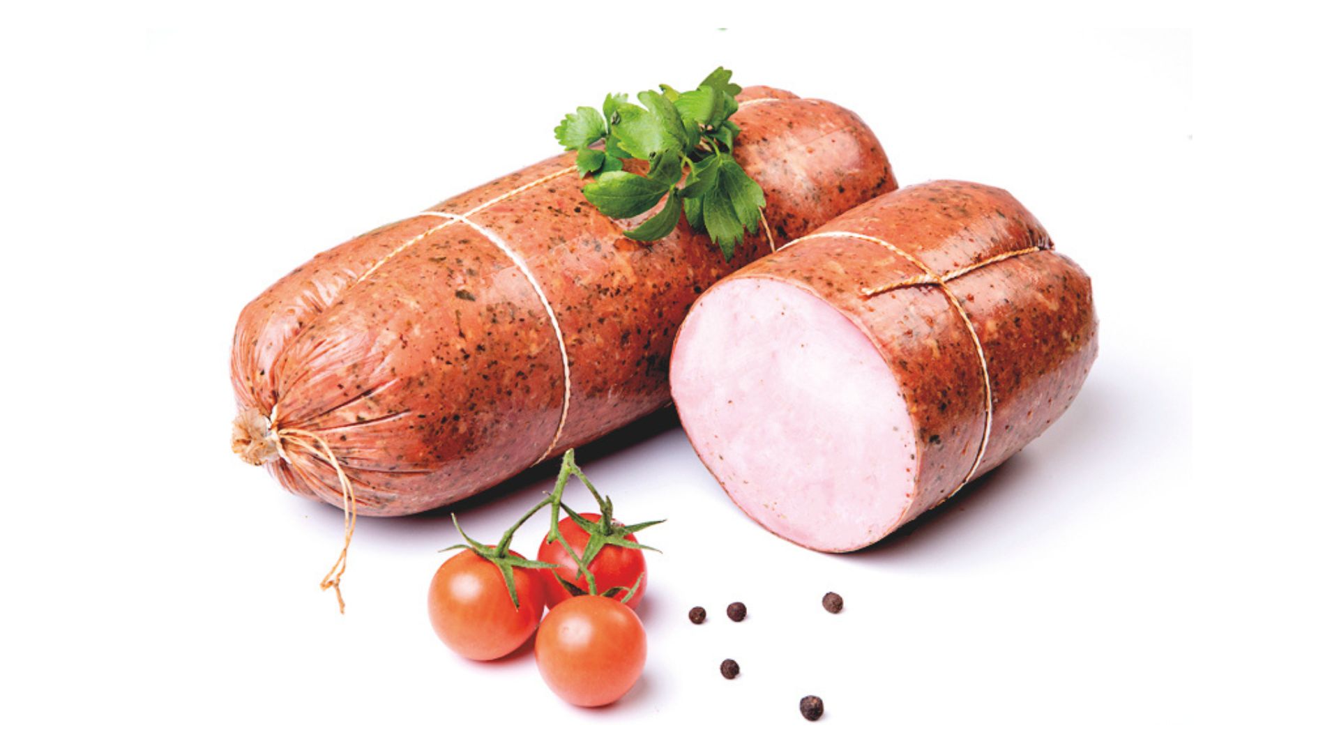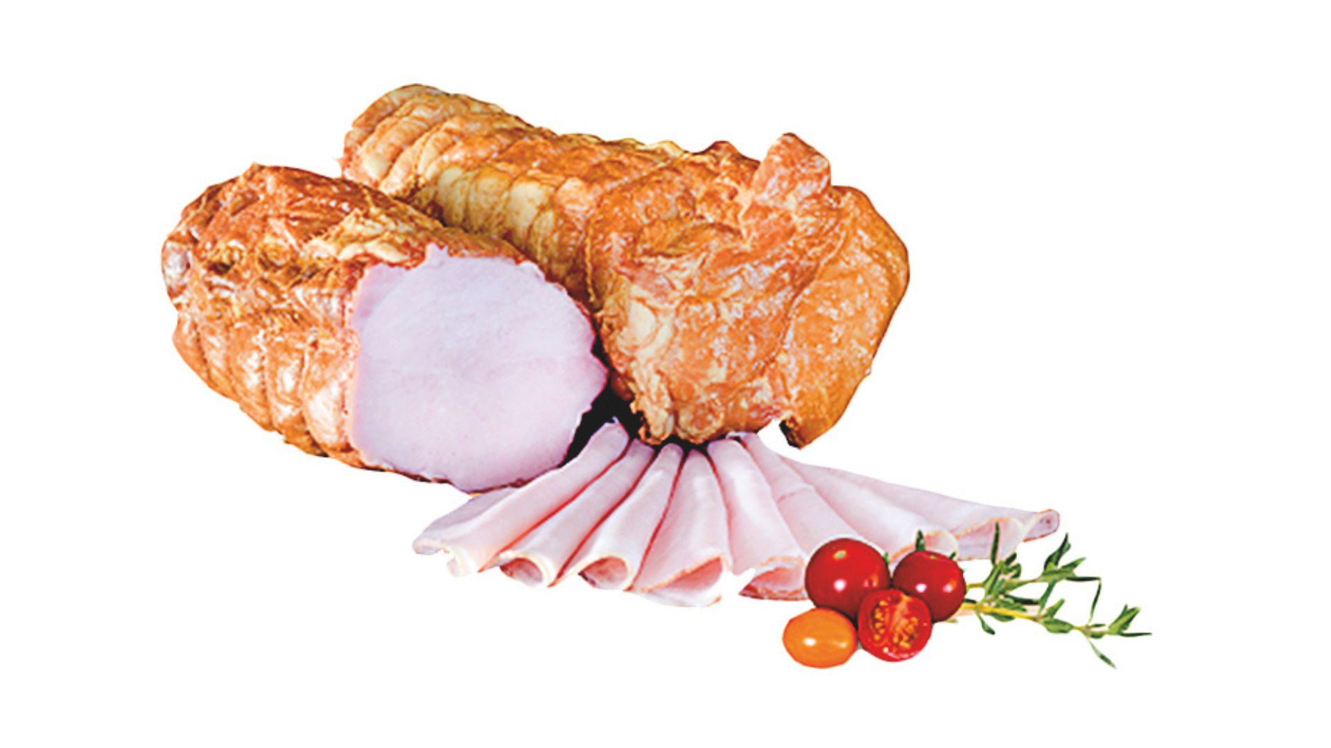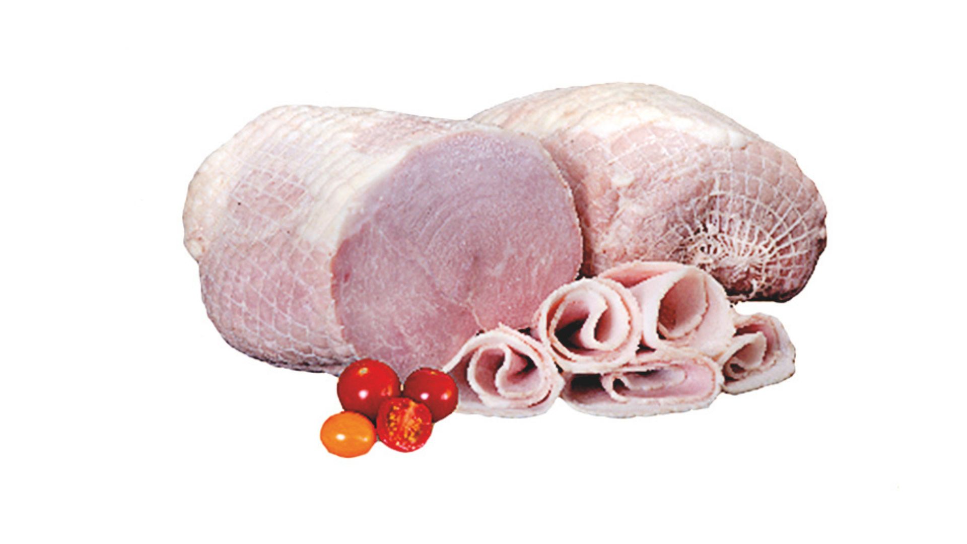 Szynka wędzona, parzona. Widoczne ślady po sznurowaniu. Szynka dobrze krajalna z delikatną okrywą tłuszczową. Na przekroju różowa.